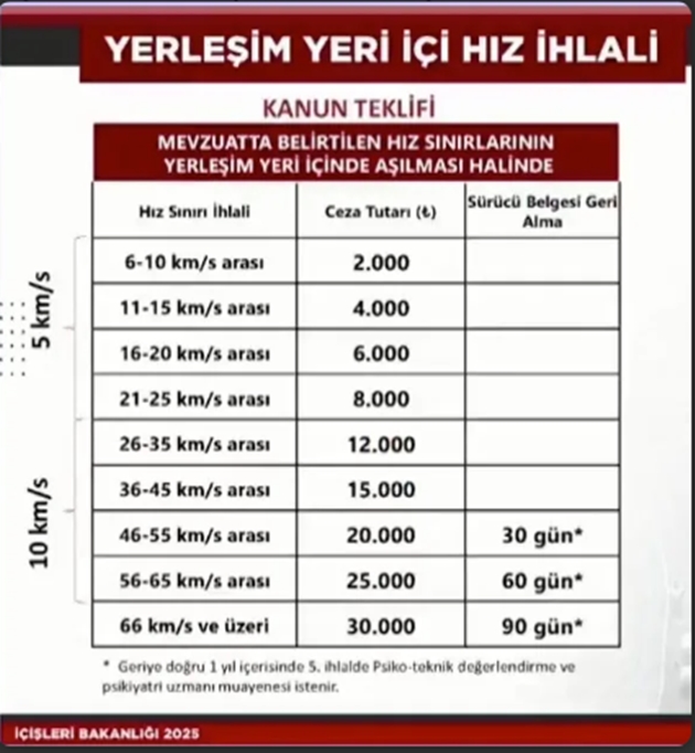 Yerleşim yeri içi hız ihlalinde kademeli cezalar kesilecek. En düşük ceza 2 bin liradan başlayıp, 30 bin liraya kadar çıkacak ve ehliyete el konacak. Bundan sonra uygulanacak hız sınırı aşım cezaları tablosu şöyle:Hız limitini aşanın ehliyeti alınacakOkul ve hastane yakınında ve önünde hız sınırı 30 KM. Ancak bugüne kadar bu kural gerektiği şekilde uygulanmadı ve sürücüler de buna riayet etmedi. Bundan böyle en büyük cezalar işte bu noktalarda kesilecek.30 kilometre hız limitli okul ve hastane önlerinde;