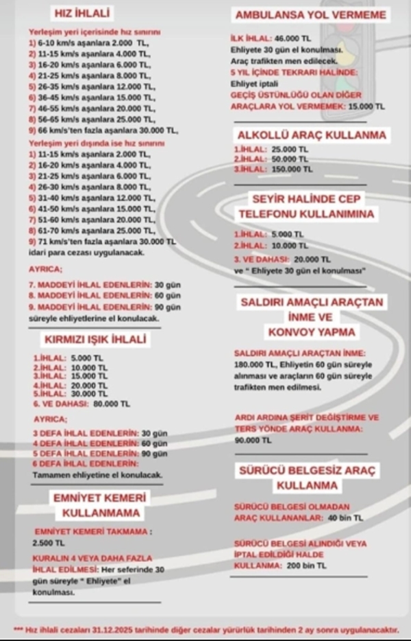 -Alkollü araç kullanımı 1. ihlal 25 bin liradan başlıyor, 3. ihlalde ceza 150 bin lira... Emniyet kemeri takmamanın cezası 2500 TL, kural 4 ve üstü ihlal edilirse her defasında 30 gün süreyle ehliyete el konulacak. -Araçtan saldırı amaçlı inme ve konvoy yapılması halinde 180 bin tl ceza, ehliyete 60 gün el koyma, araçları 60 gün trafikten men etme.