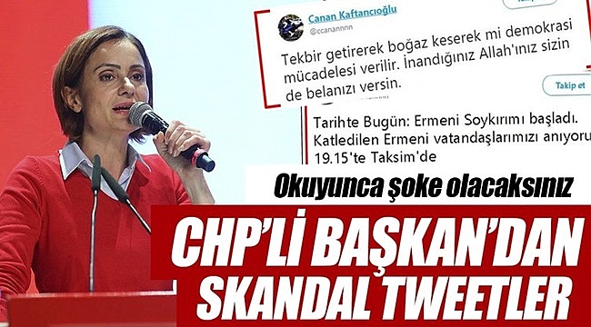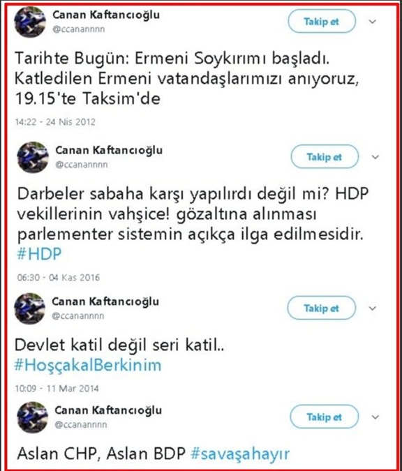 CHP'nin dün yapılan kongreyle İstanbul teşkilatına başkan olarak seçilen Canan Kaftancıoğlu'nun, 15 Temmuz'da darbeyi durduran halka 'DAEŞ'çi' muamelesi yaptığı tweetler ortaya çıktı. Gezi ve Kobani provokasyonunu destekleyen Kaftancıoğlu’nun Ermeni soykırım yalanı hakkında attığı skandal tweetler ise çok başını ağrıtacak. Devlete “seri katil” diyen Canan Kaftancıoğlu’nun HDP’ye verdiği destek ise gözlerden kaçmıyor.