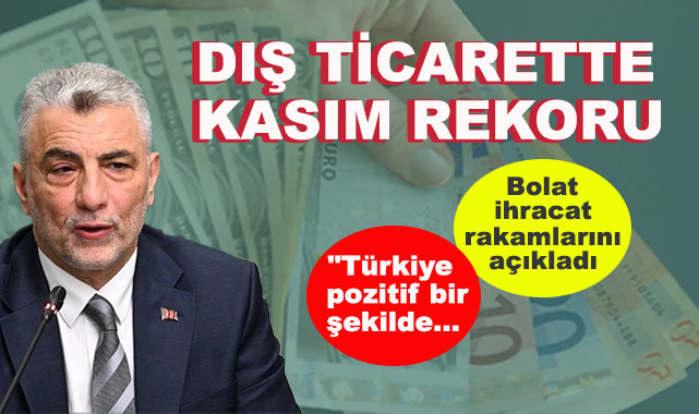 Ticaret Bakanı Ömer Bolat, kasım ayı ihracat rakamlarını açıkladı. Buna gör,e kasımda ihracat geçen yılın aynı ayına göre yüzde 5,2 artarak 23 milyar 11 milyon dolar oldu. Bakan Bolat, kasımda tarihin en yüksek aylık ihracat rakamına ulaştıklarını söyledi.
