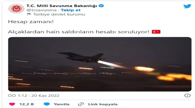 Bakanlığın sosyal medya hesabından "Hesap zamanı! Alçaklardan hain saldırıların hesabı soruluyor!" paylaşımı yapıldı. Paylaşımda, bir Türk savaş uçağının pistten kalkış anına ilişkin fotoğrafa da yer verildi.