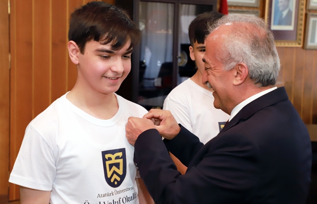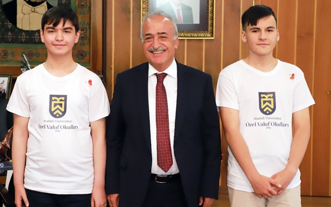 Basın toplantısı sonrası Rektörlük binasına geçen Vakıf Okulları Yönetimi ve Türkiye birincileri, başarılarının mutluluğunu Atatürk Üniversitesi Rektörü Prof. Dr. Ömer Çomaklı ile paylaştı.