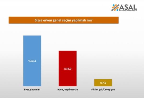 ASAL Araştırma ’nın Ocak 2026’da 2.000 kişiyle yaptığı kamuoyu yoklamasına göre, erken genel seçim yapılmasını isteyenlerin oranı yüzde 54,4 olarak ölçüldü. Katılımcıların yüzde 38’i erken seçime karşı olduğunu belirtirken, yüzde 7,6’lık kesim fikir belirtmedi veya soruya yanıt vermedi.